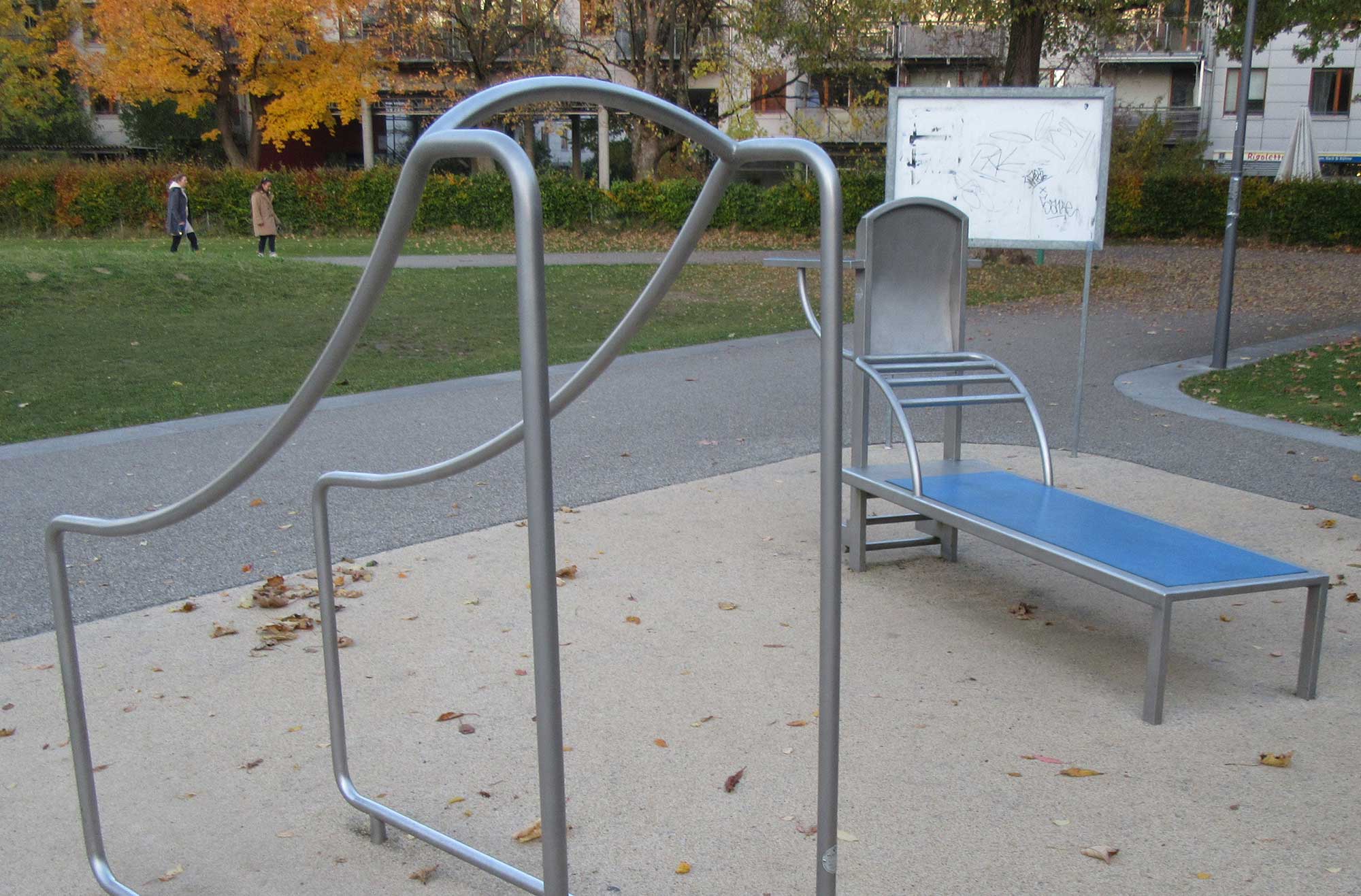 Wenden Sie sich nach links und schon ist eine Sportanlage zu sehen: ein 4Circle Parcour – so der neumodische Name. Ältere Semester kennen das Maskottchen noch aus den 1970er Jahren: Trimmy. Die Tafeln erläutern die Funktion der Geräte. Wer sich fit fühlt, darf sich erproben.