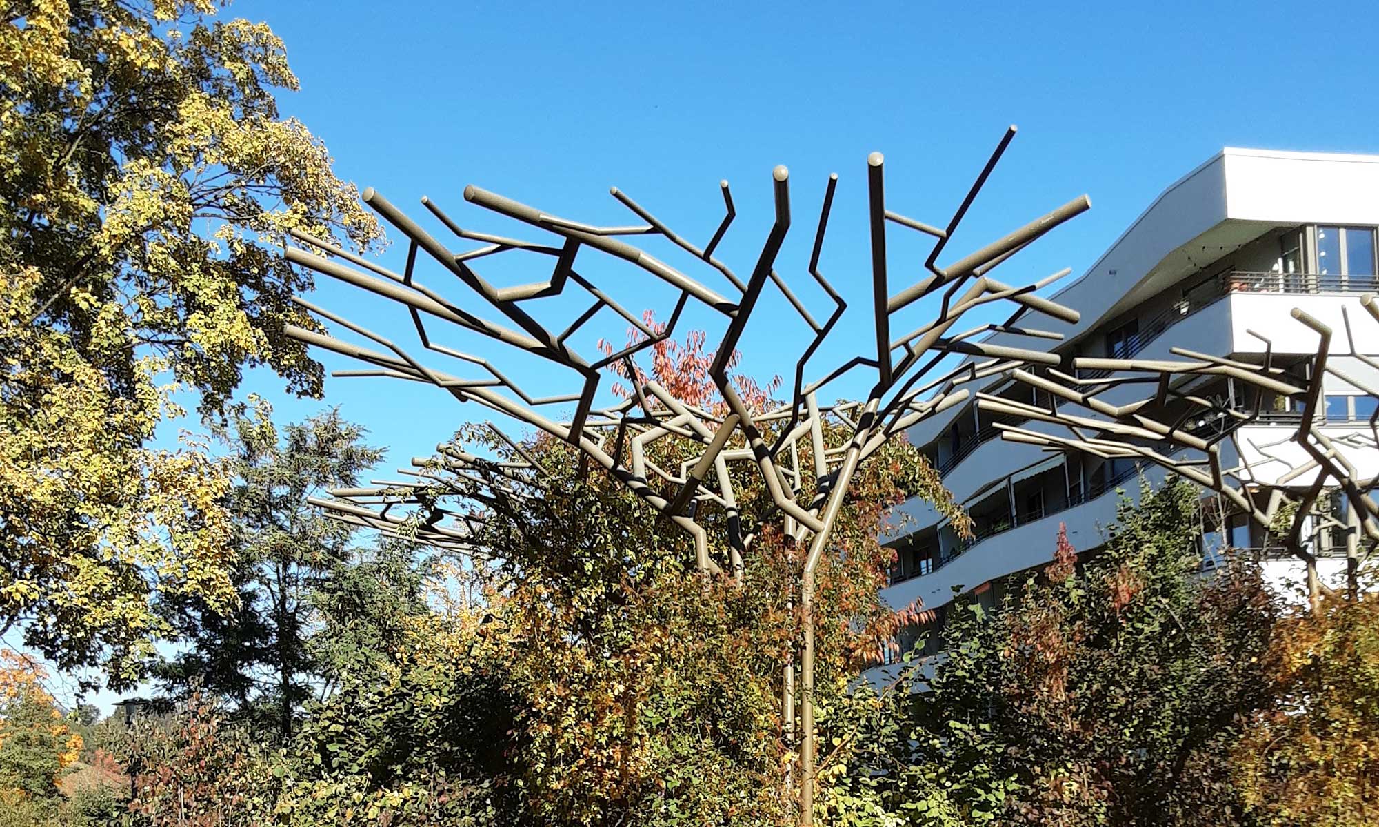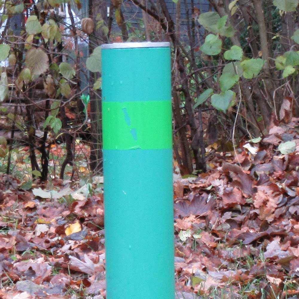 lassen den Bücherschrank rechts liegen und gehen in Richtung Grünanlage. Manche Tiere dürfen den Rasen nicht betreten, insbesondere eine Hunderasse. Das zeigen diese grünen Pfosten an.