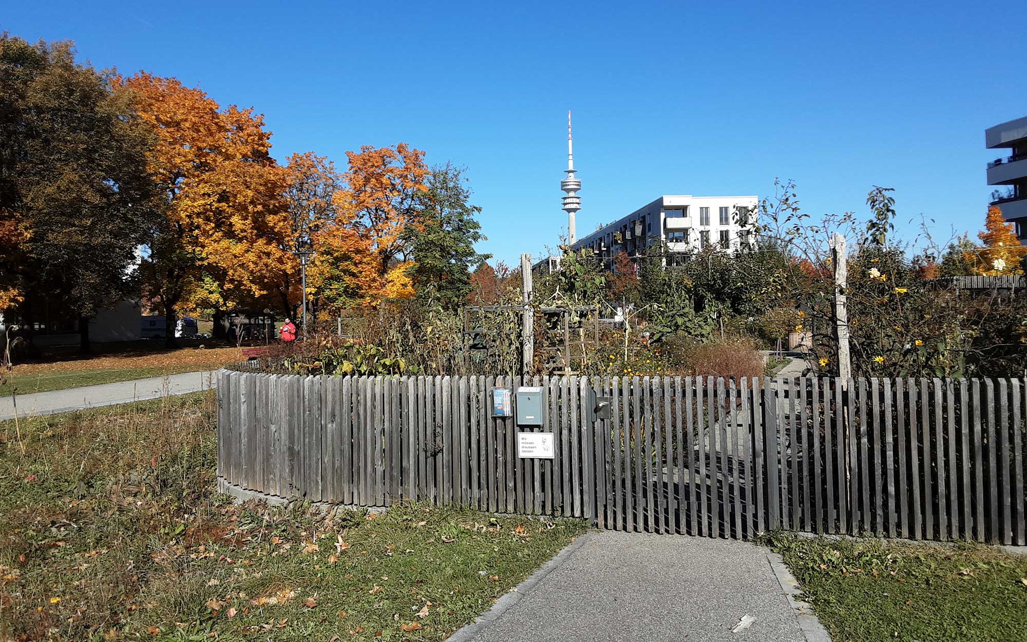 mit einem eingezäunten Grundstück, der so genannte „Stadtacker“, ein Projekt des Vereins Ackermannbogen. Seit 2018 gärtnern hier mehrere Dutzend Nachbar:innen, unterstützt von einer/einem hauptamtlichen Koordinator:in. Gemeinschaftliches Gärtnern heißt, in Themengruppen gemeinsam zu säen, pflanzen und zu ernten. Die Idee hat sich inzwischen in vielen Stadtvierteln verbreitet.